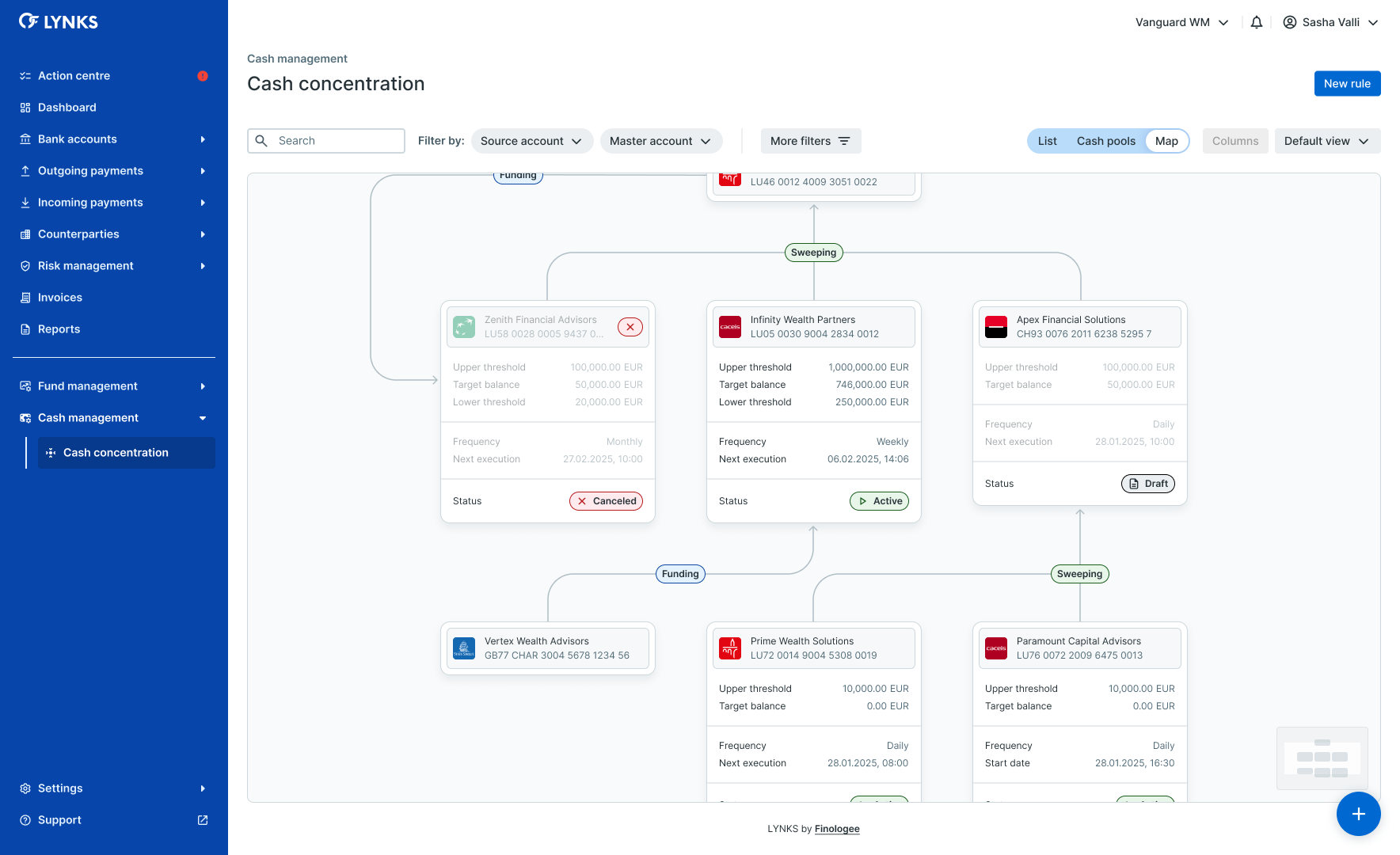- Start with clear objectives — Define your liquidity management goals before configuring rules, whether maximizing investment returns, centralizing operations, or maintaining minimum balances