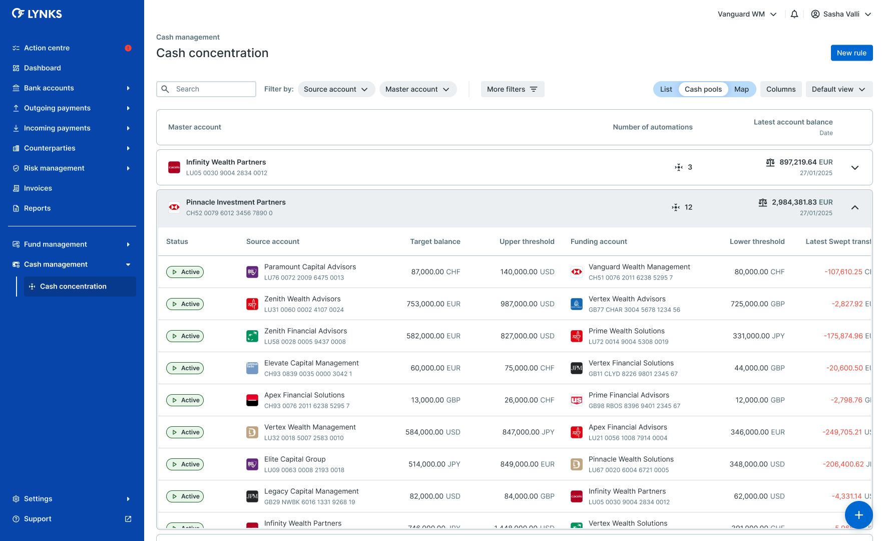 The cash pools view groups automations by their master account, showing which accounts sweep funds to each concentration target. Expand and collapse cash pools to see all source accounts sweeping to a specific master account.