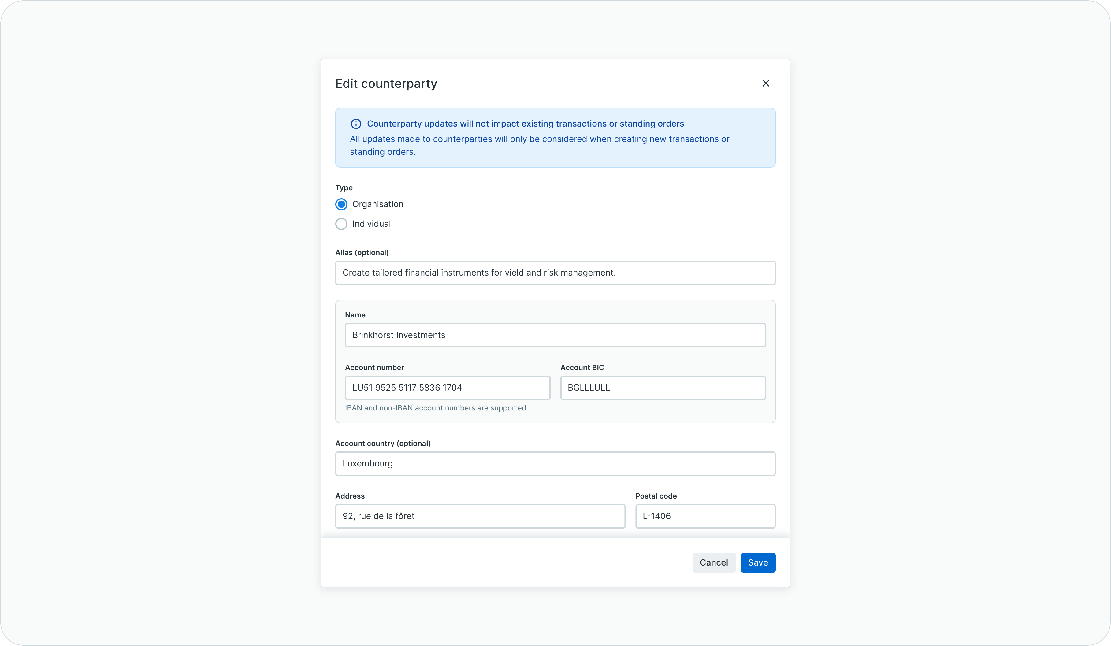 In side the editing modal, modify the information about the counterparty and save the changes