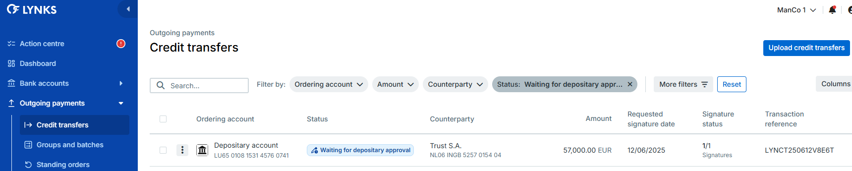 Depositary approval is an additional workflow step required for credit transfers initiated from accounts flagged as investment accounts. This feature provides fund depositaries with oversight and control over payment processing, ensuring compliance with fund statutes and regulatory requirements.