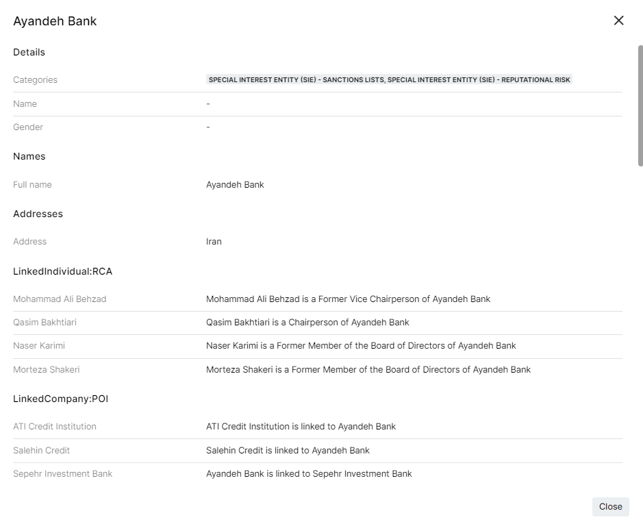 - Category - Classification in screening database (sanctions, PEP, adverse media)