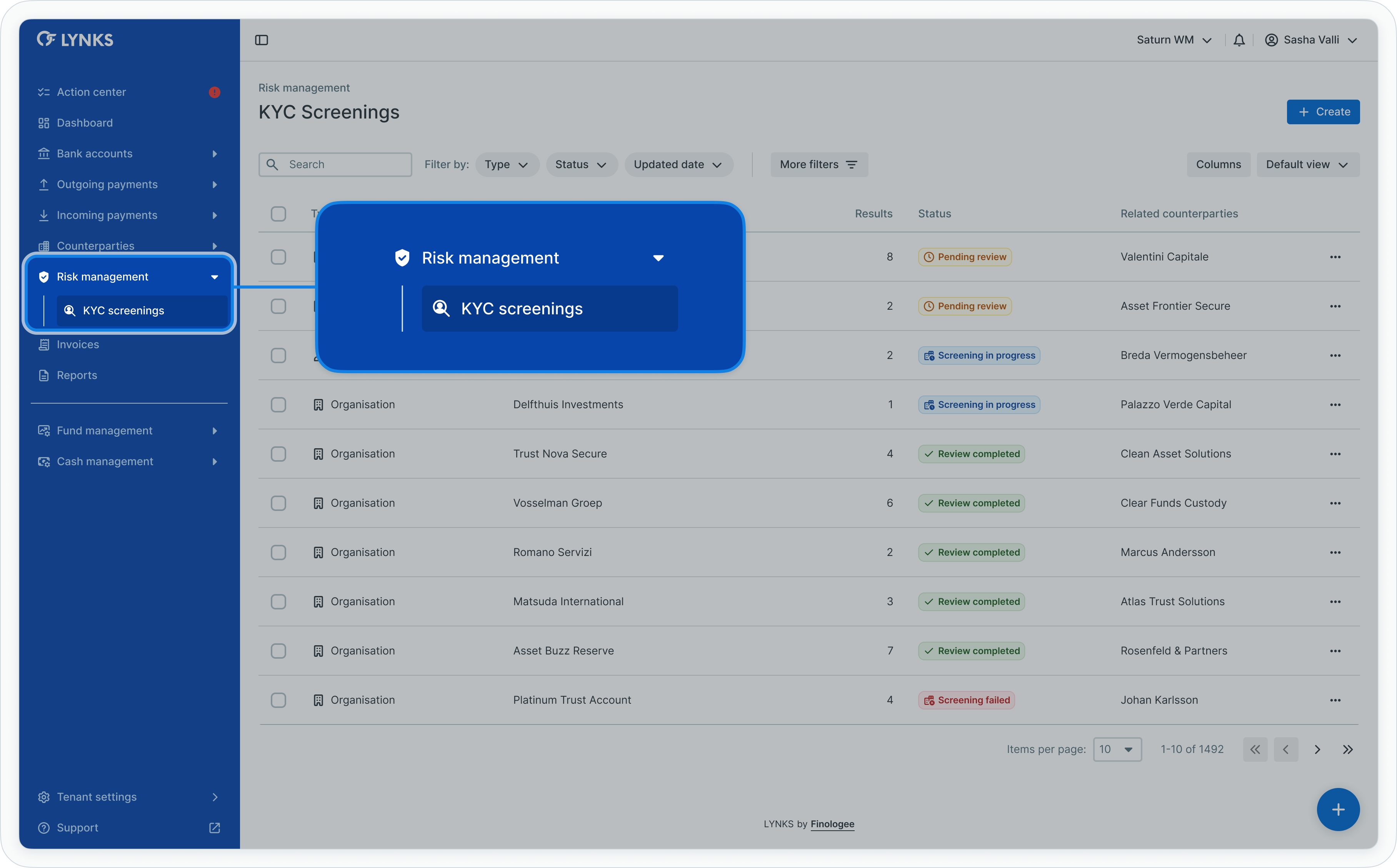 In the Risk management section, LYNKS provides users with efficient tools for managing and monitoring their screening activities, promoting a smooth and compliant experience. The dedicated section provided in LYNKS enables the possibility to manage KYC screenings effortlessly. The configuration of the and to configure counterparty monitoring is part of the settings section only available for administrators.