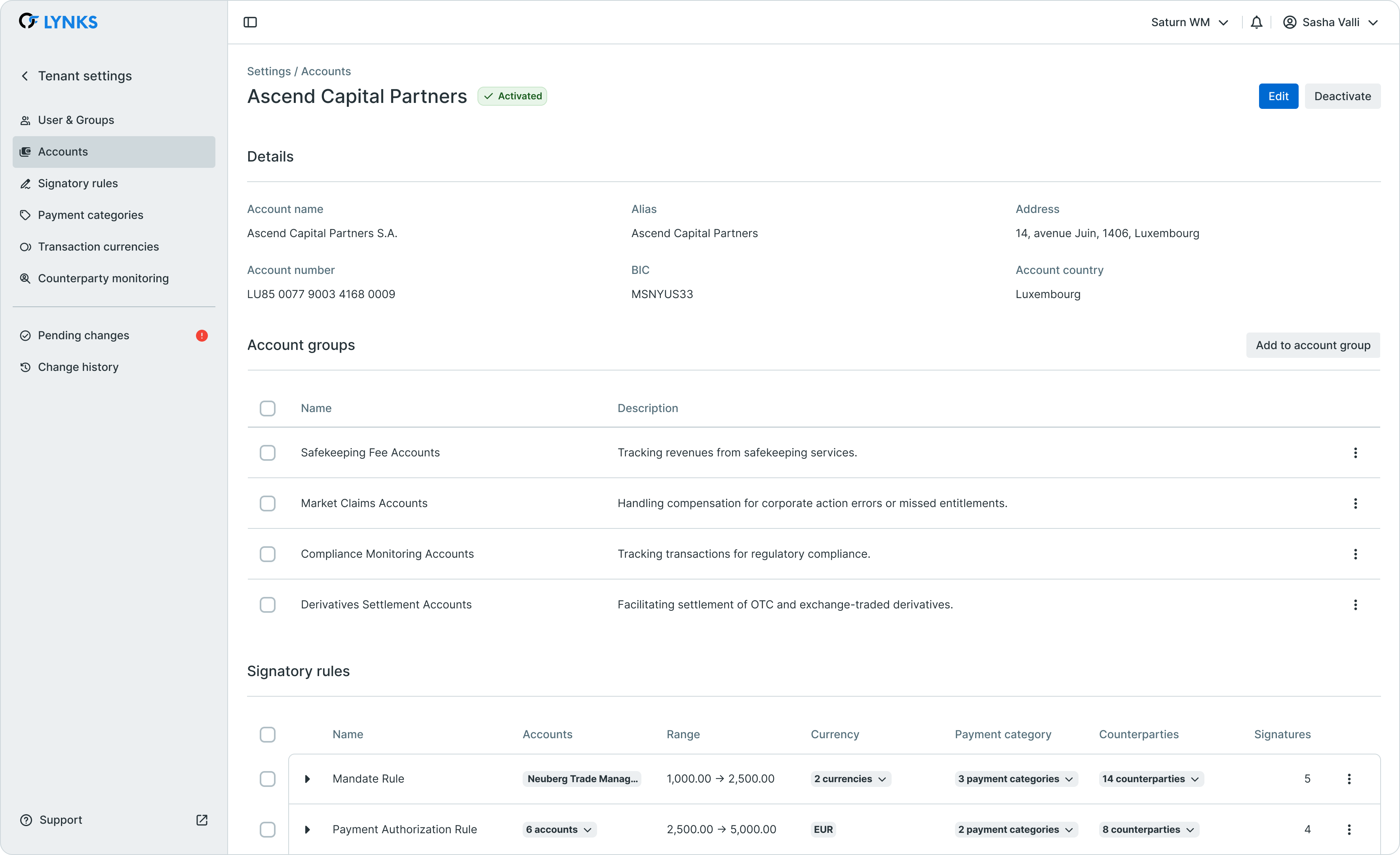 Also the association of the account groups is listed directly followed by the audit log saving all the changes. A dedicated section is displaying the signatory rules that apply for the selected account. Account details are editable and deactivation is possible from the details screen.