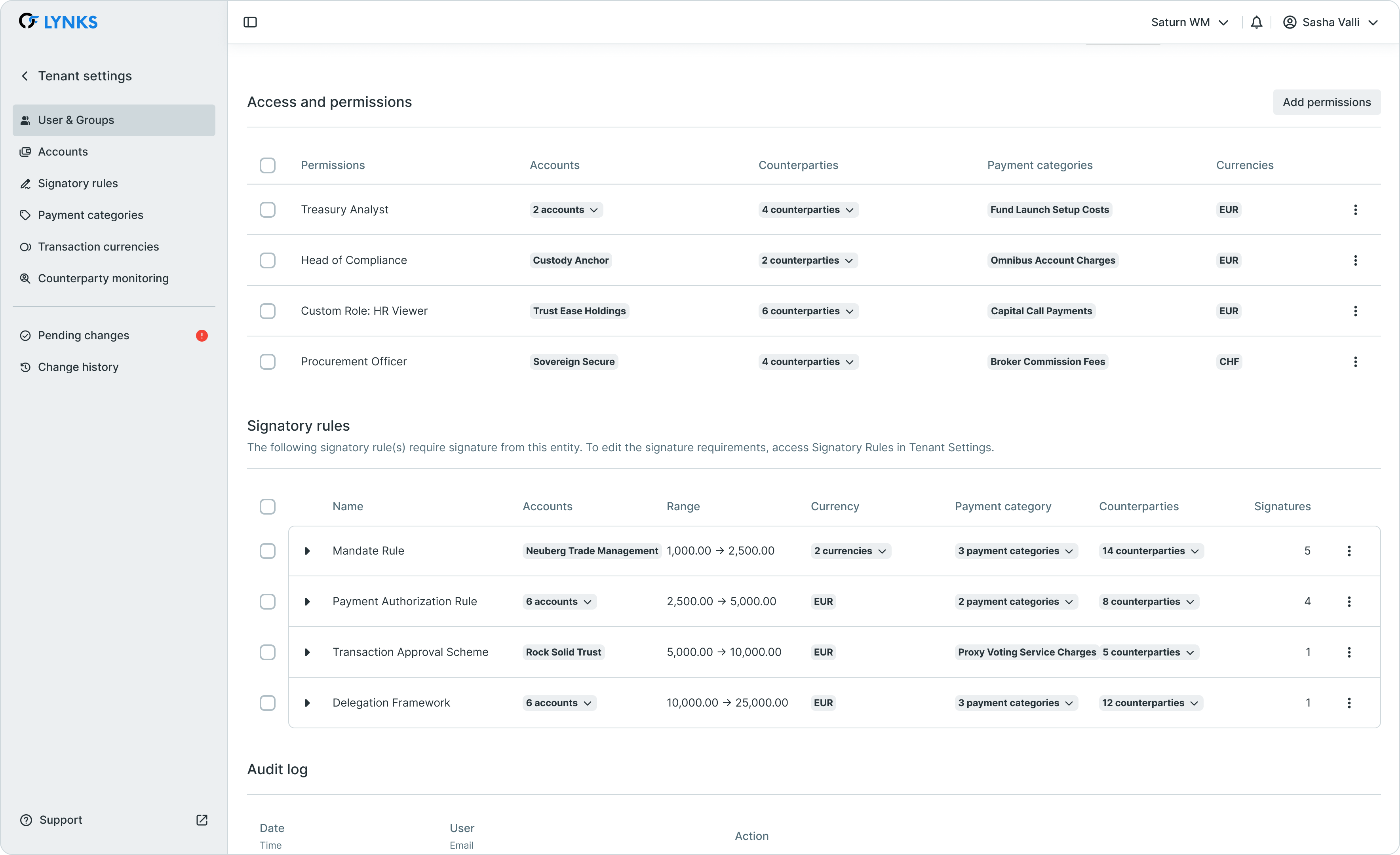 Below are the Signatory rules associated with each user group. An expandable section allows you to view the rules that can be signed by each group. This view mirrors the one found on the signatory rules page in the settings. Finally, the audit log tracks all changes made to the user group.