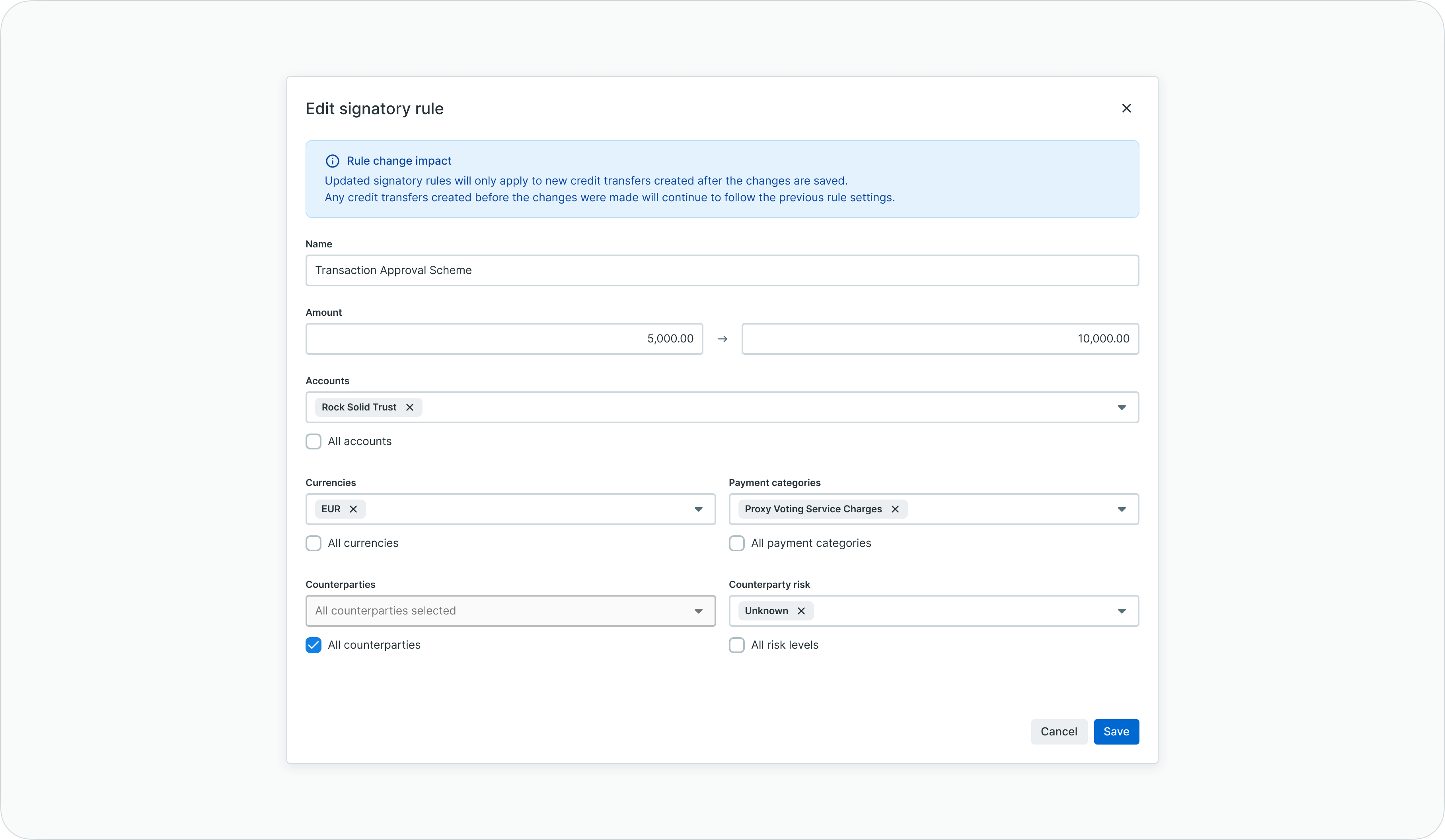 Each signatory rule defines its scope through a combination of parameters. When a user creates a payment, the platform validates whether the selected values match an existing signatory rule. The rule that applies to a transaction determines which users can approve it and how many signatures are required.