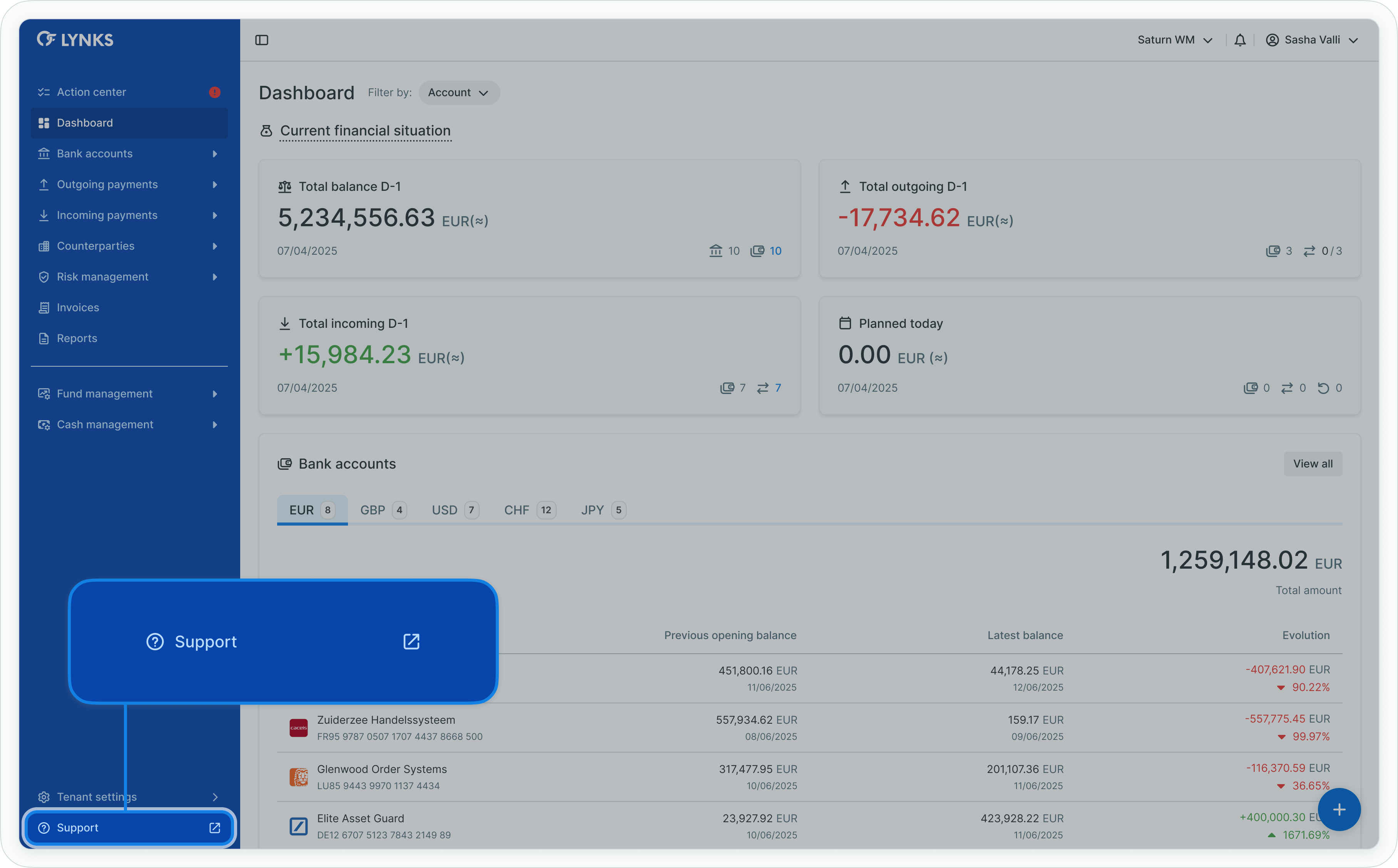 The support button in the LYNKS interface provides direct access to Finologee's customer support portal.